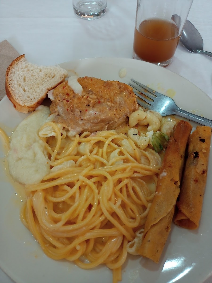 Muslos de Pollo En Salsa de Cacahuate Puré de Papa Spaghetti Rojo Flautas Deliciosas